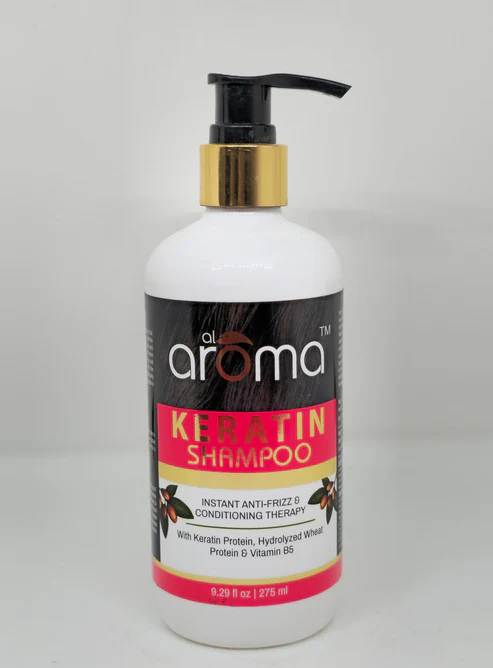 Al Aroma Keratin Shampoo gently cleanses, strengthens, and repairs damaged hair while restoring smoothness, shine, and softness. Ideal for frizz control and long-lasting nourishment.