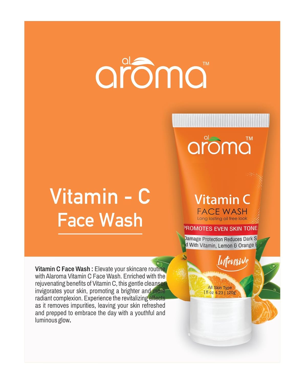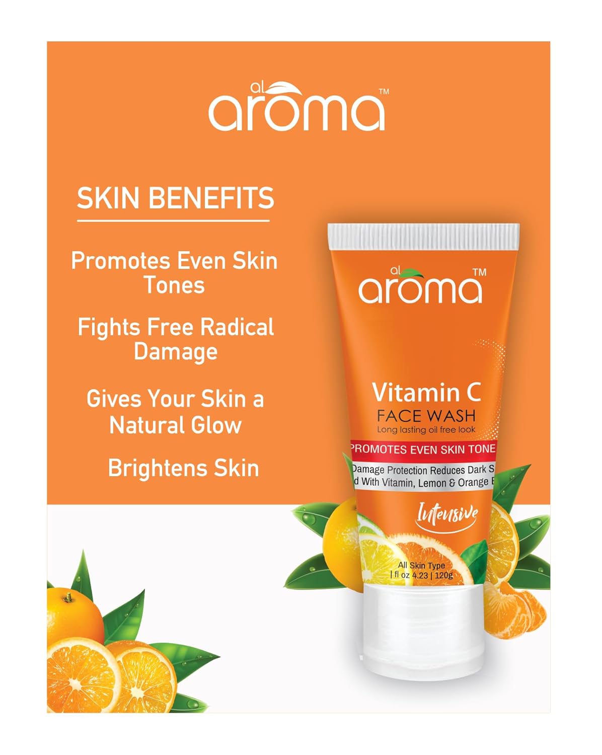 Al aroma Vitamin C Face Wash deeply cleanses, brightens dull skin, reduces dark spots, and refreshes with natural Lemon & Orange extracts, making skin soft, glowing, and healthy. Suitable for all skin types.