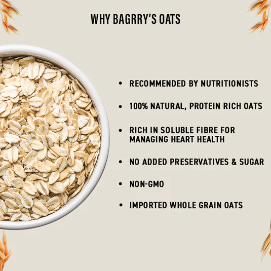 Nutritious, high-protein Bagrry’s White Oats – rich in fibre, supports heart health, lowers cholesterol, and cooks quickly for a wholesome, healthy breakfast or snack.
