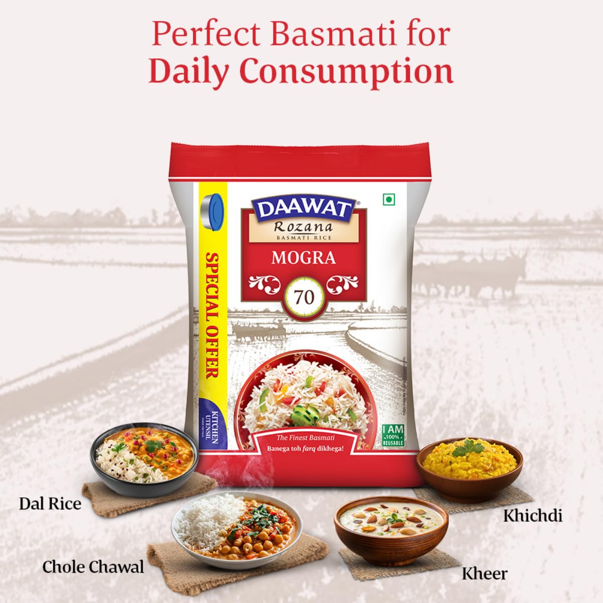 With its delightful fragrance and soft texture, this rice elevates simple dishes into flavorful experiences. Whether it is plain steamed rice with dal, a light pulao, or a delicious biryani, Daawat Rozana Mogra ensures consistent taste and quality in every serving.