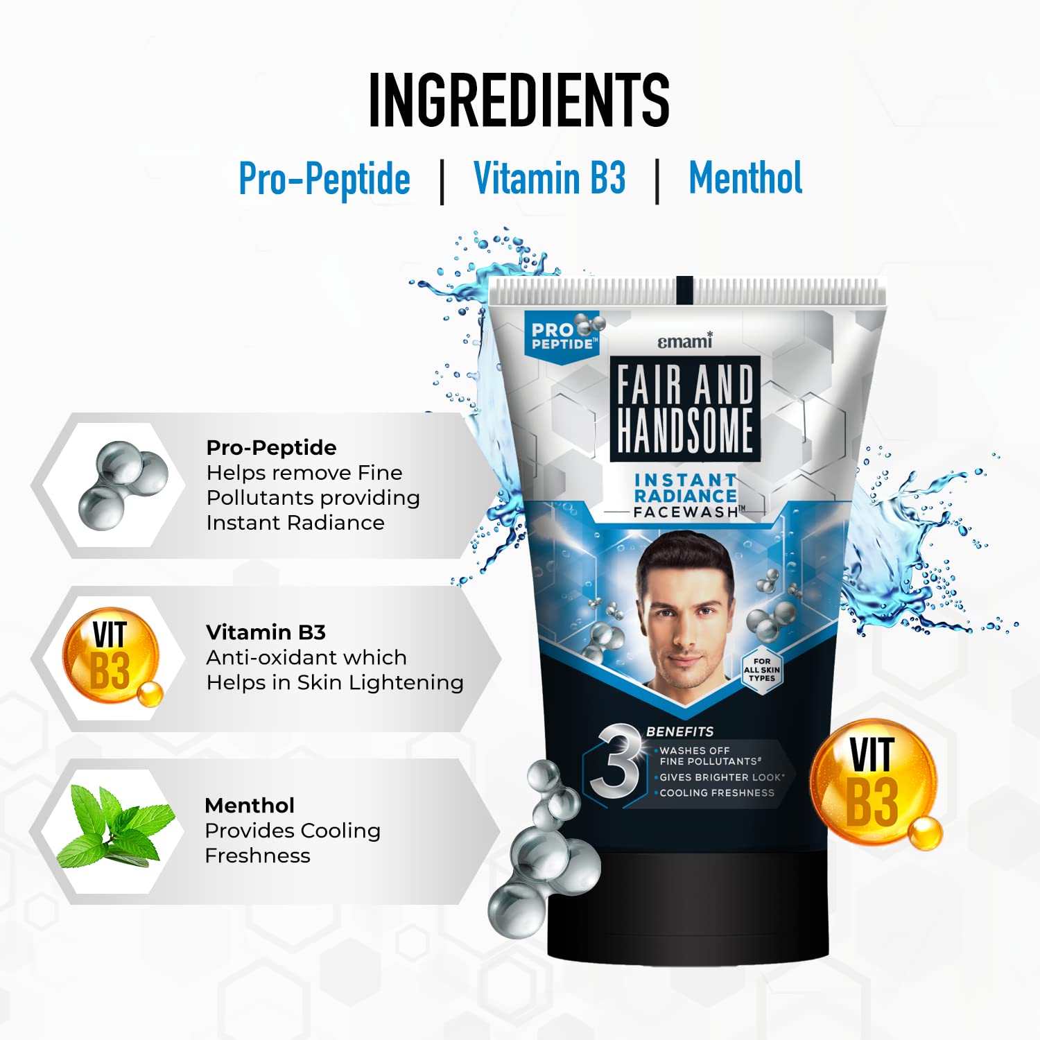 Formulated with Acti-Fair Peptide Complex and Vitamin B3, it penetrates deep into the skin to cleanse pores, control sebum production, and lighten dull spots, giving you a visibly fairer and smoother complexion. Its energizing menthol refreshes your skin instantly, making it feel cool, clean, and recharged after every wash.