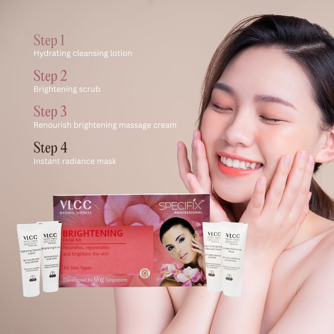 Each step of the VLCC Specifix Brightening Facial Kit — cleanser, scrub, massage cream, and pack — is carefully designed to deliver visible results. The cleanser removes dirt and impurities, the scrub gently exfoliates dead skin cells, the massage cream replenishes lost moisture and energizes the skin, and the brightening pack completes the treatment by tightening and illuminating the skin.