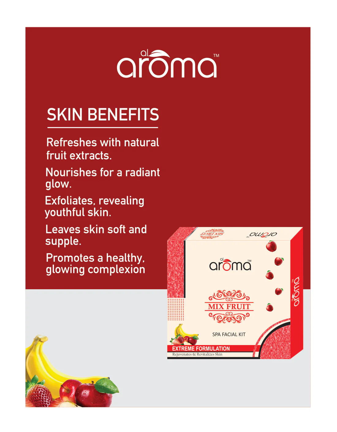 Al Aroma Mix Fruit Spa Facial Kit (290 g) – A rejuvenating skincare solution enriched with the goodness of natural fruit extracts. Brightens, refreshes, and nourishes your skin for a healthy, glowing complexion.