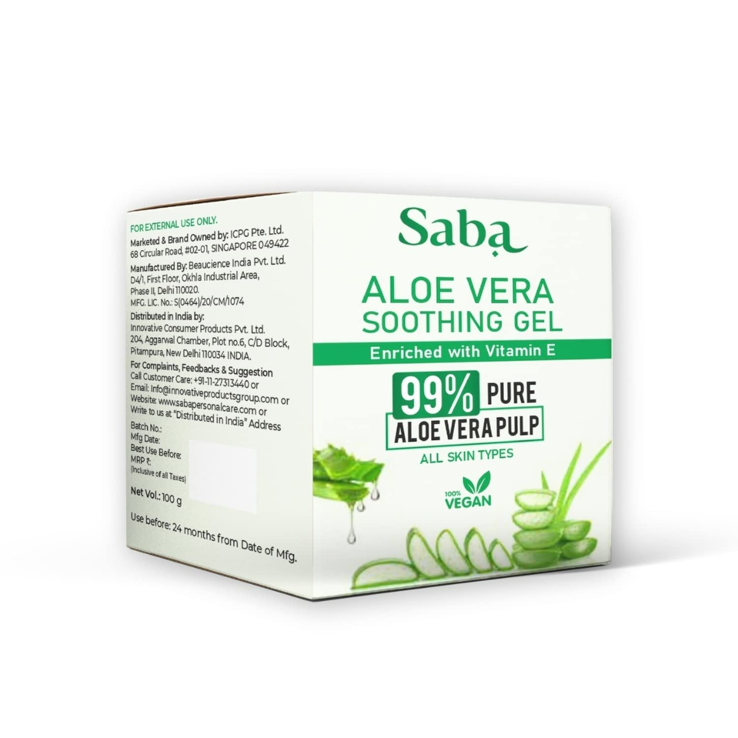 Saba Pure Aloe Vera Gel enriched with Vitamin E helps soothe, hydrate, and repair skin. Ideal for reducing acne, scars, and blemishes while leaving skin glowing and radiant. Suitable for all skin types.